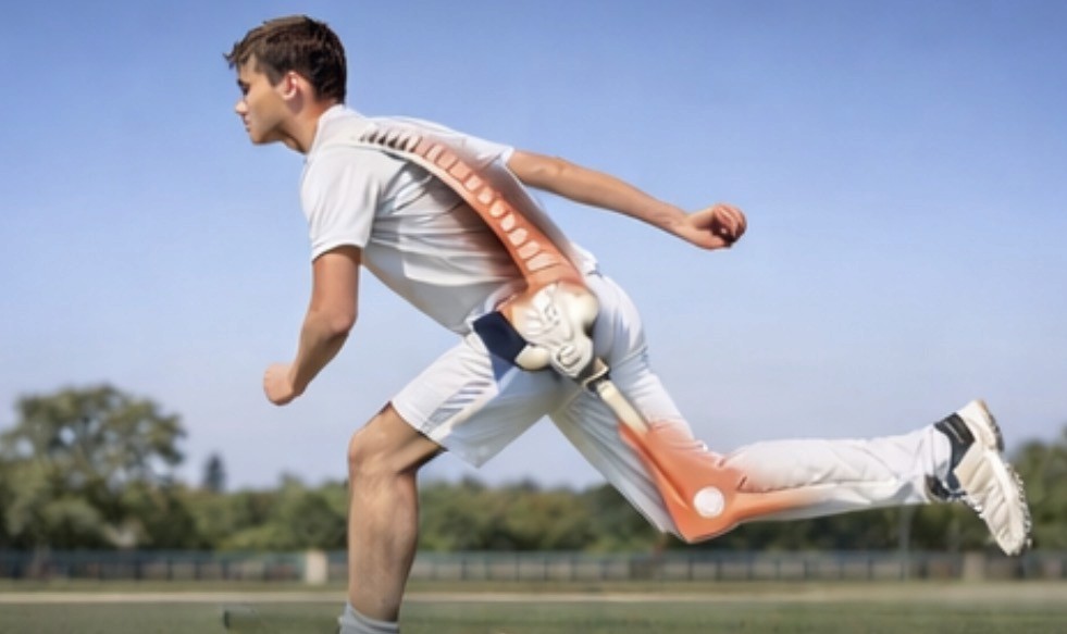 Fast bowling places repeated stress through the lower back. In teenagers, especially during rapid growth, the skeleton is growing faster than it is strengthening. That mismatch creates a window where the spine is more vulnerable to what we call flexion / extension or bending overload.